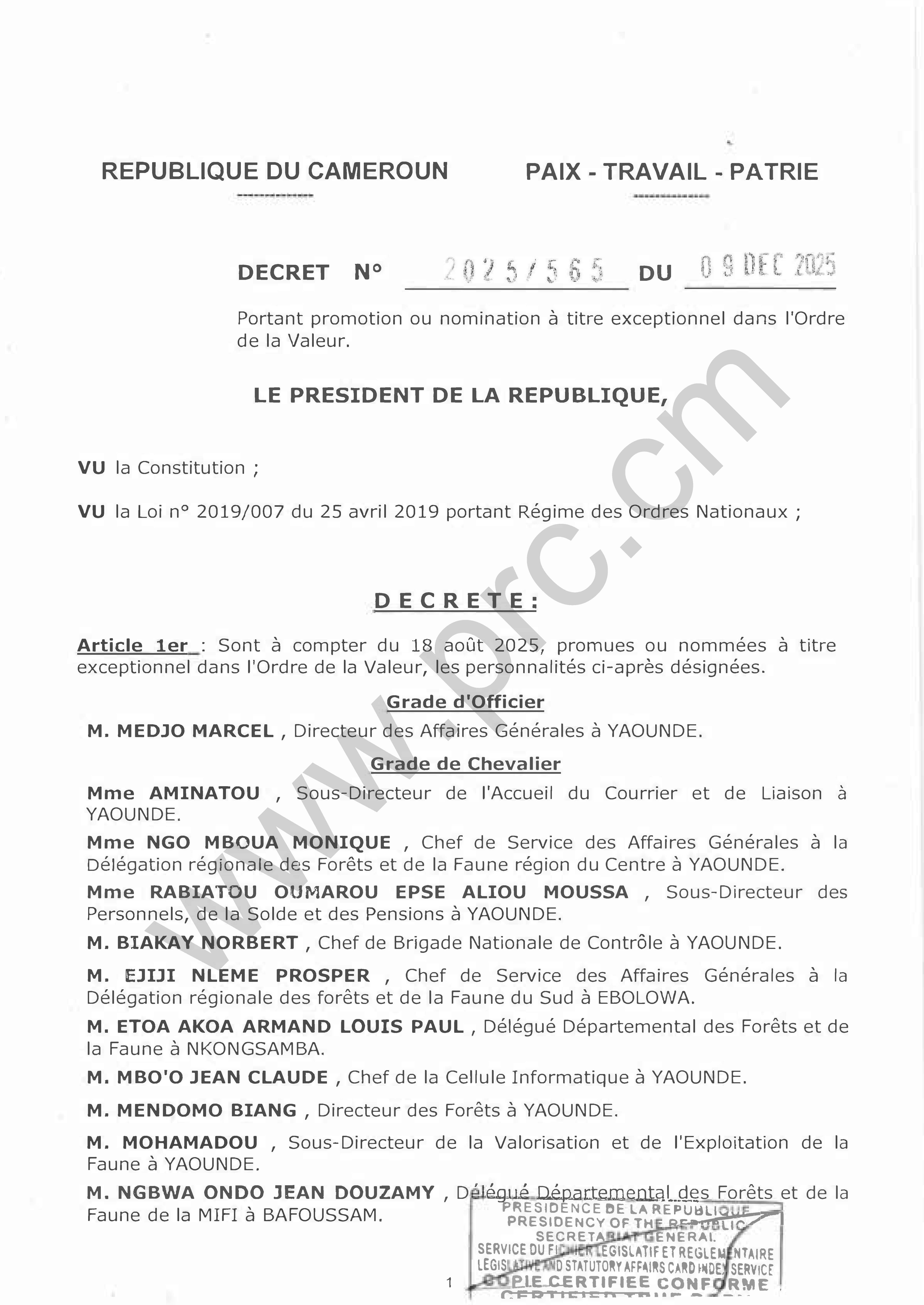 Décret N°2025/565 du 09 décembre 2025 portant promotion ou nomination à titre exceptionnel dans l'Ordre de la Valeur Imprimer Tweet Télécharger l'intégralité du texte (pdf) < Précédent Suivant >