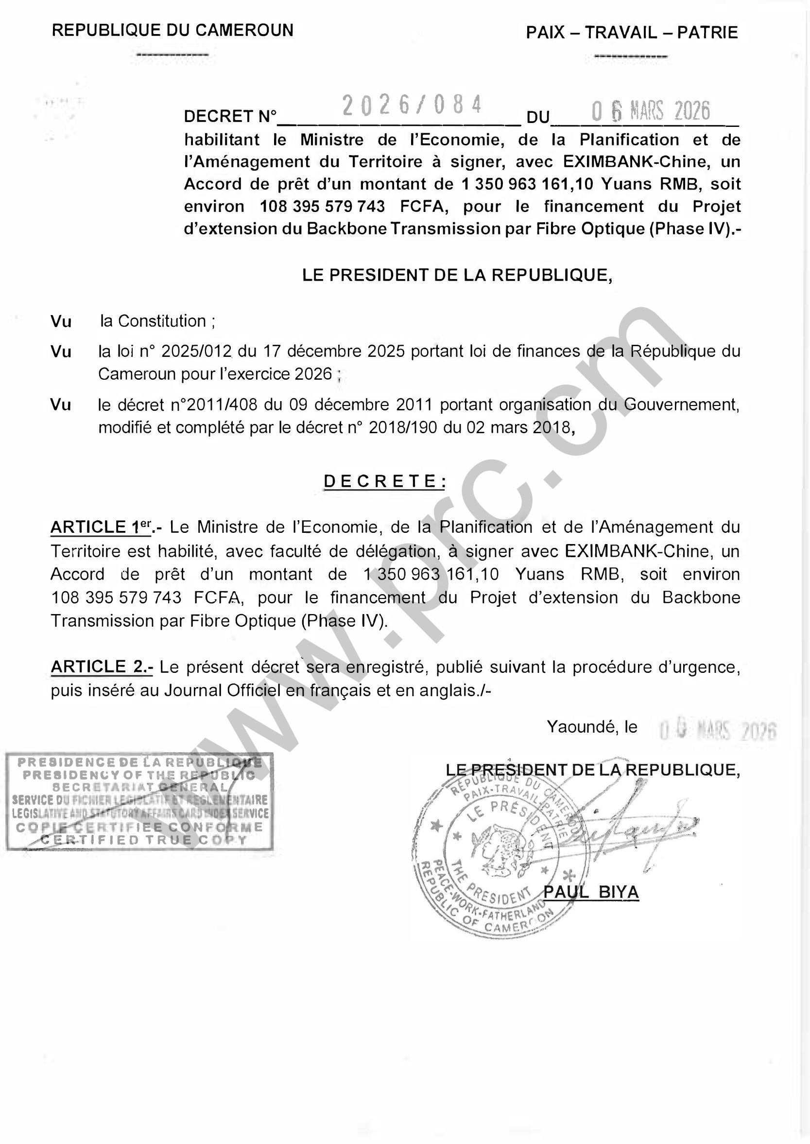Décret N°2026/084 du 6 mars 2026 autorisant la signature d’un Accord de prêt pour le financement du Projet d'extension du Backbone Transmission par Fibre Optique (Phase IV) Imprimer Tweet Télécharger (pdf) Suivant >