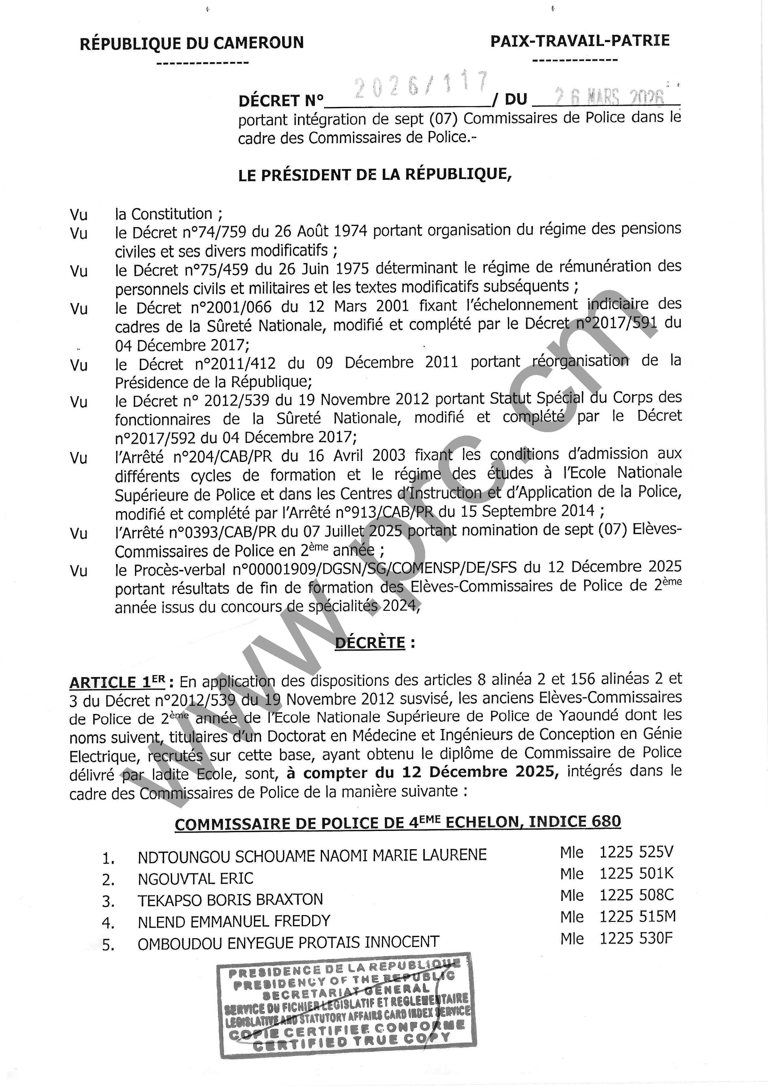 Décret N°2026/117 du 26 mars 2026 portant intégration de sept (07) Commissaires de Police dans le cadre des Commissaires de Police Imprimer Tweet Télécharger le décret (PDF) < Précédent Suivant >