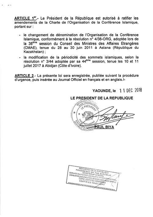 Loi N° 2018/015 du 11 décembre 2018 autorisant le Président de la République à ratifier les amendements de la Charte de l’Organisation de la Conférence Islamique (OCI) Imprimer Tweet Télécharger l’intégralité de la loi (pdf) < Précédent Suivant >