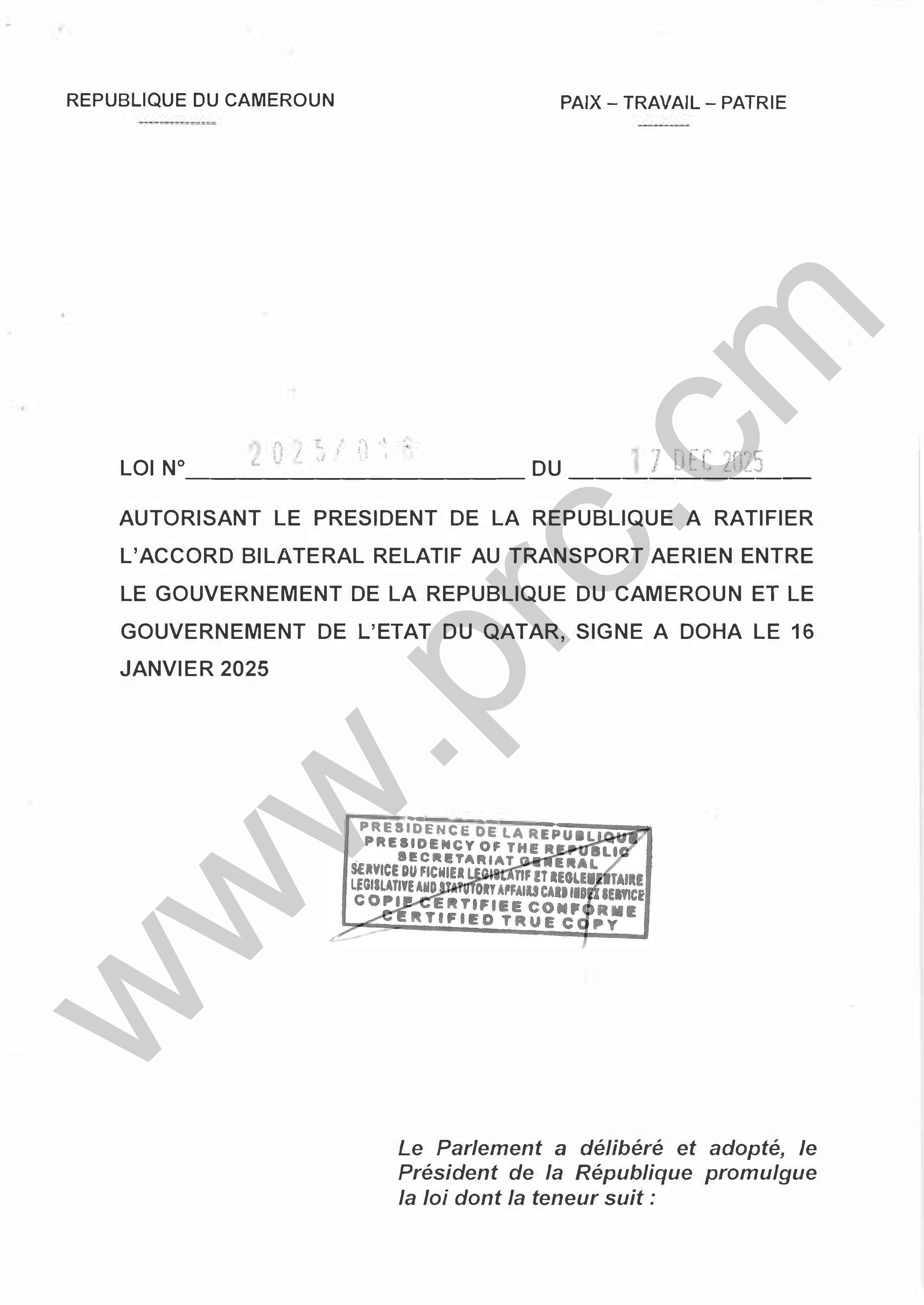 Loi N°2025/016 du 17 décembre 2025 autorisant le Président de la République à ratifier l'accord bilatéral relatif au transport aérien entre le Cameroun et le Qatar, signé à Doha le 16 janvier 2025 Imprimer Tweet Télécharger la loi (PDF) < Précédent Suivant >