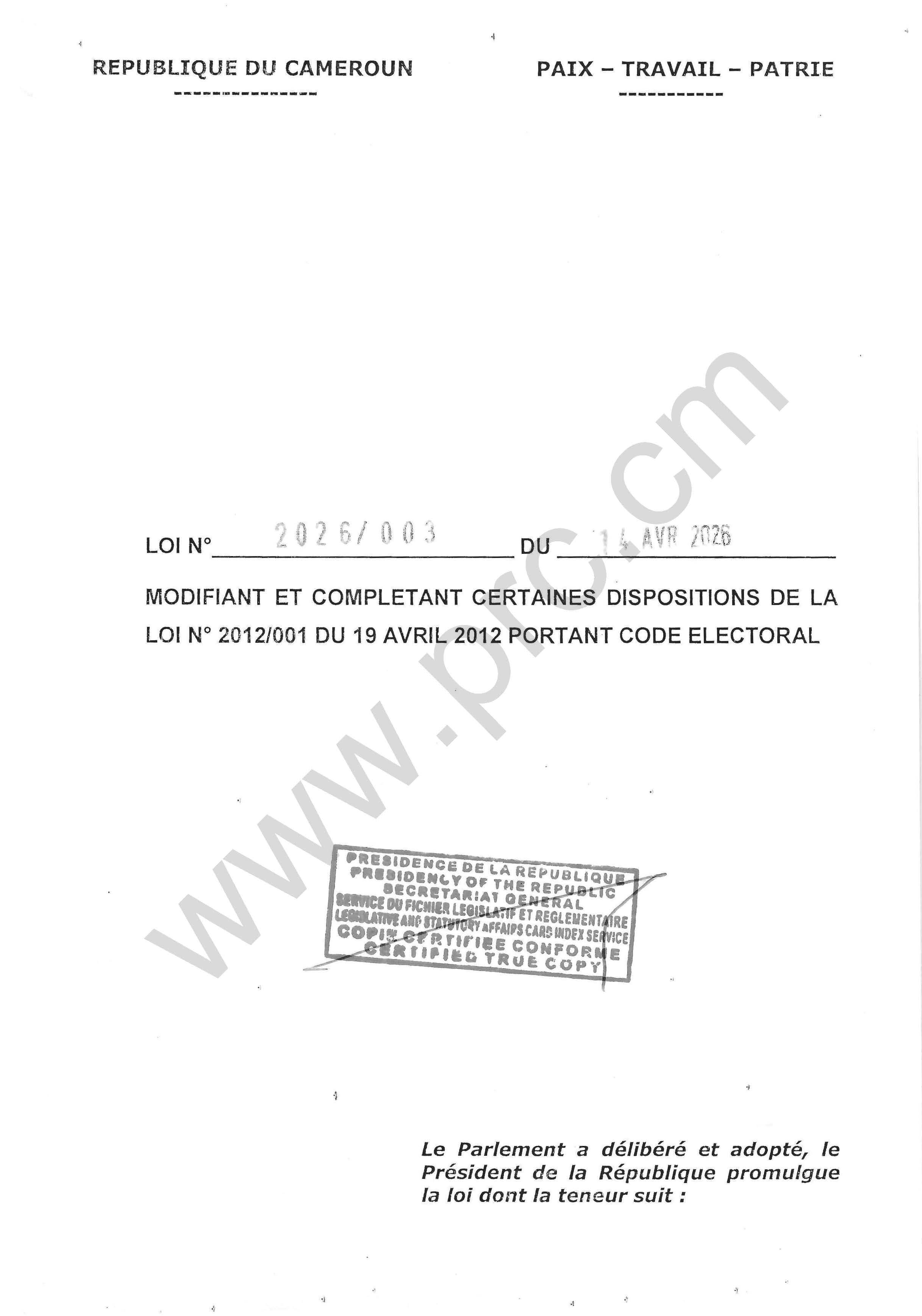 Loi N°2026/003 du 14 avril 2026 modifiant et complétant certaines dispositions de la loi N°2012/001 du 19 avril 2012 portant code électoral Imprimer Tweet Télécharger la loi (PDF) < Précédent Suivant >