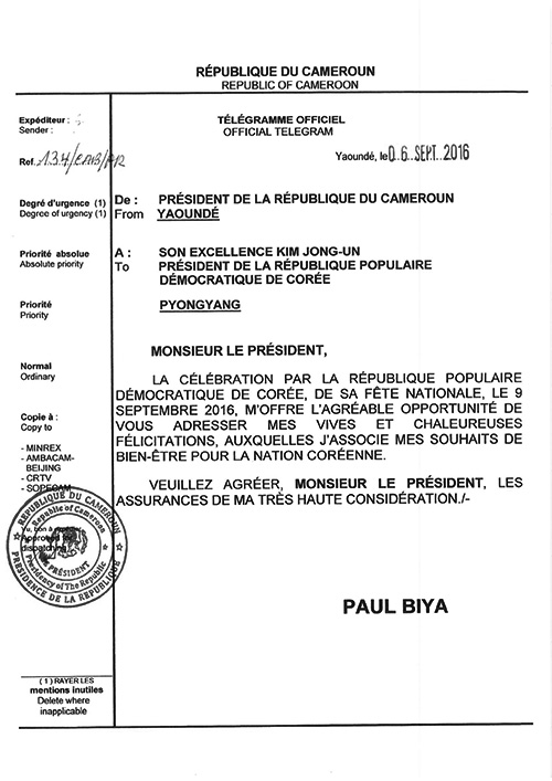 Les félicitations du Chef de l’Etat à S.E. KIM JONG-UN à l’occasion de la fête nationale de la République Populaire Démocratique de Corée, le 09 septembre 2016. Imprimer Tweet < Précédent Suivant >