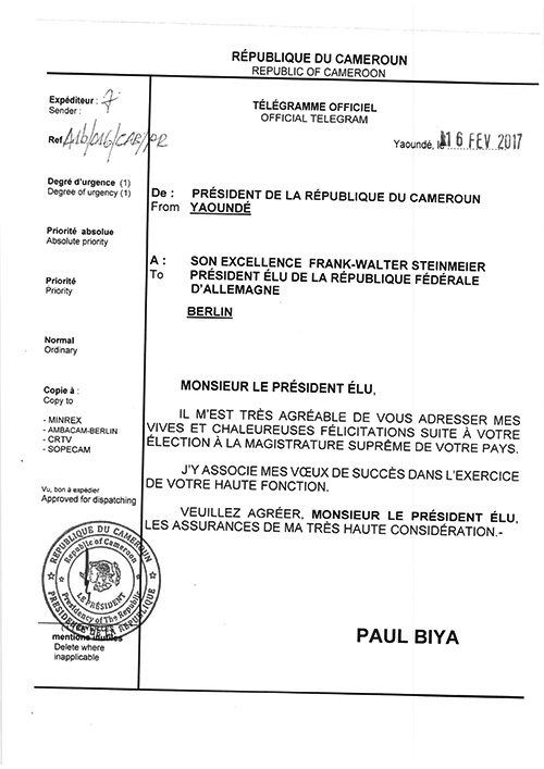 Les félicitations du Chef de l’Etat à S.E. FRANK-WALTER STEINMEIER, Président élu de la République Fédérale d’Allemagne. Imprimer Tweet