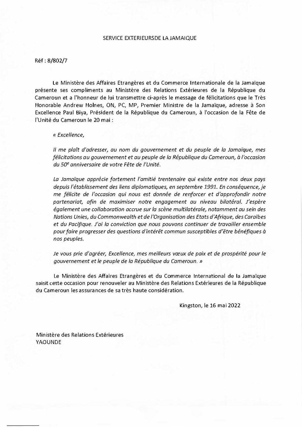 Message de félicitations du Très Honorable Andrew Hoines, Premier Ministre de la Jamaïque au Chef de l’État, à l'occasion de la fête nationale de la République du Cameroun, le 20 mai 2022 Imprimer Tweet < Précédent Suivant >