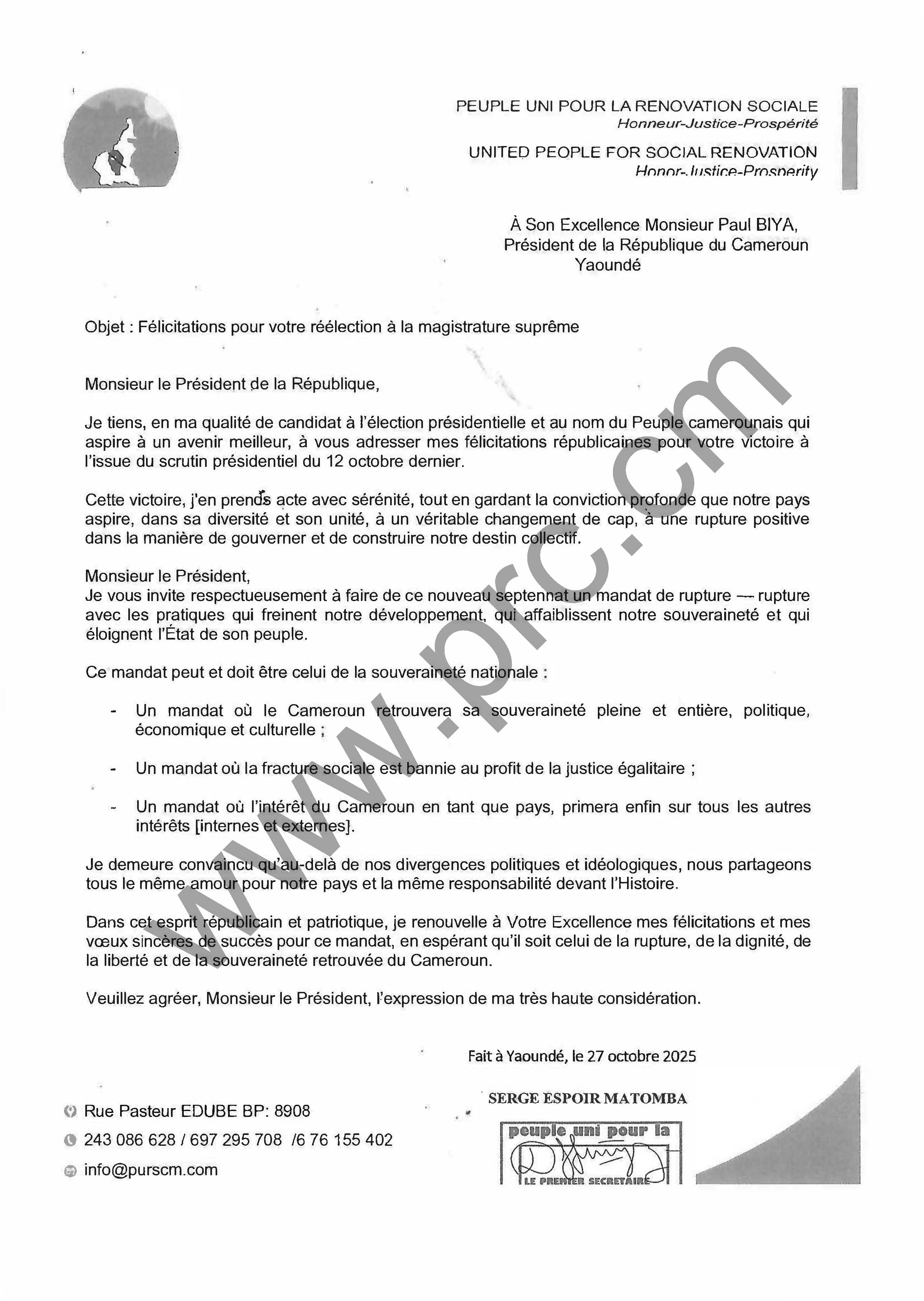 Félicitations de M Serge Espoir Ma Tomba, Président du parti du Peuple Uni Pour La Rénovation Sociale à SE Paul Biya, suite à sa réélection à la Magistrature Suprême du Cameroun, le 27 octobre 2025 Imprimer Tweet < Précédent Suivant >