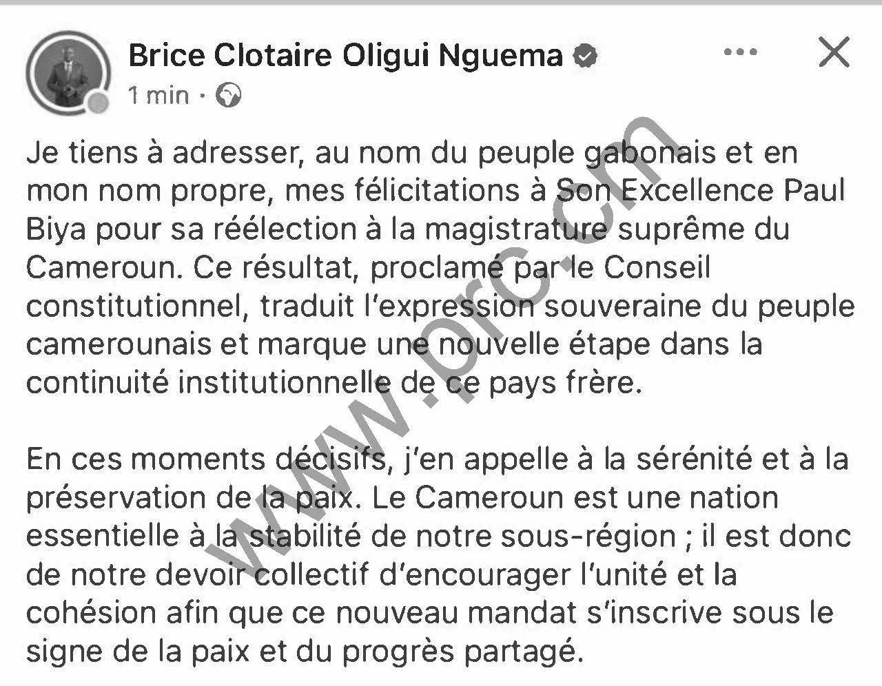 Félicitations de SE Brice Clotaire Oligui Nguema Président de la République Gabonaise à SE Paul Biya, suite à sa réélection à la Magistrature Suprême du Cameroun, le 27 octobre 2025 Imprimer Tweet < Précédent Suivant >