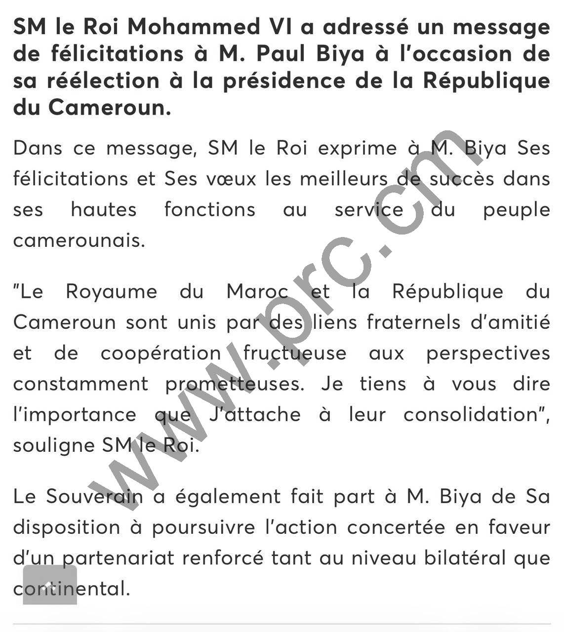 Félicitations de Sa Majesté Mohammed VI Roi du Maroc à SE Paul Biya, suite à sa réélection à la Magistrature Suprême du Cameroun, le 27 octobre 2025 Imprimer Tweet Suivant >