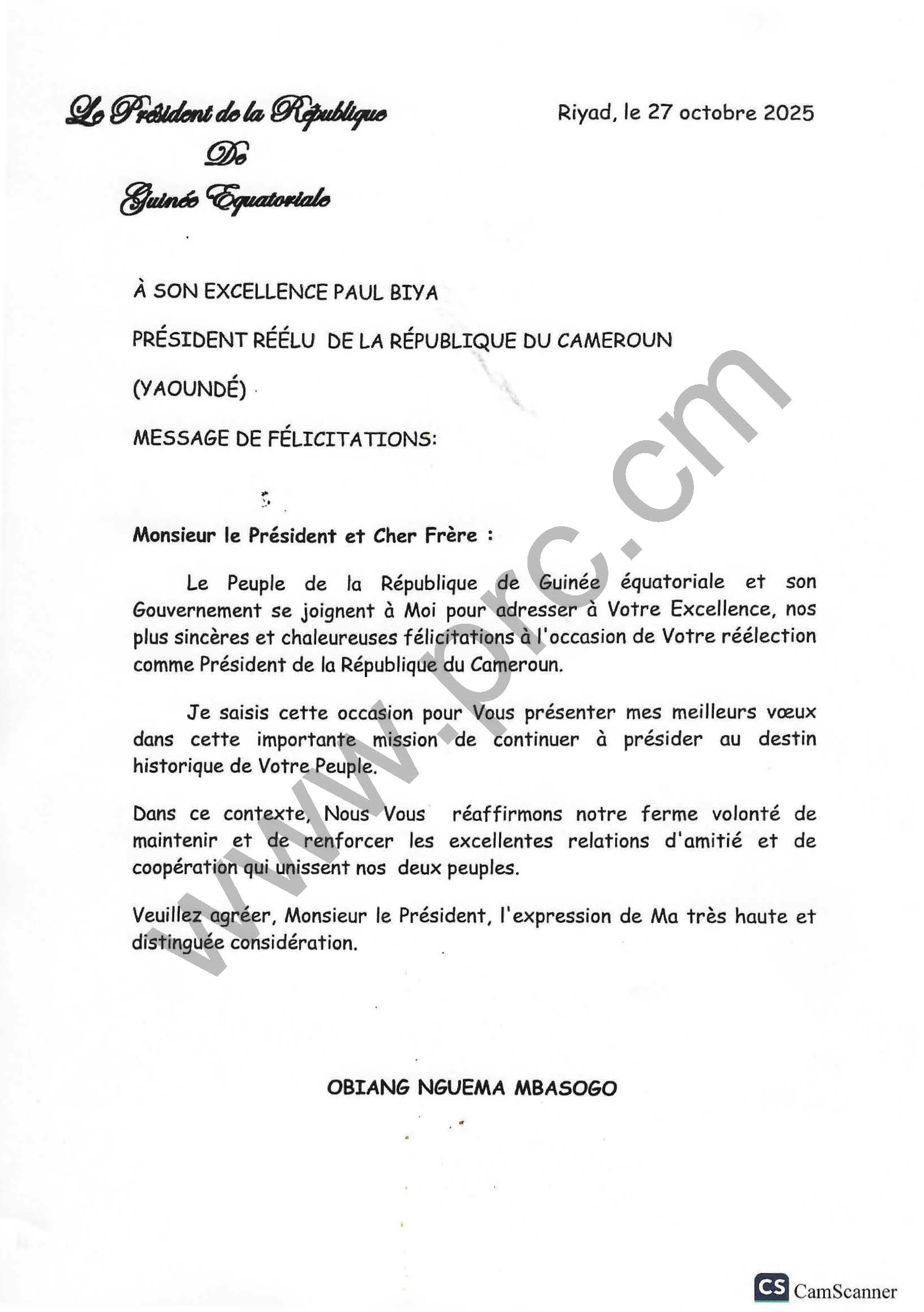 Félicitations de SE Obiang Nguema Mbasogo Président de la République de Guinée Équatoriale à SE Paul Biya, suite à sa réélection à la Magistrature Suprême du Cameroun, le 27 octobre 2025 Imprimer Tweet < Précédent Suivant >