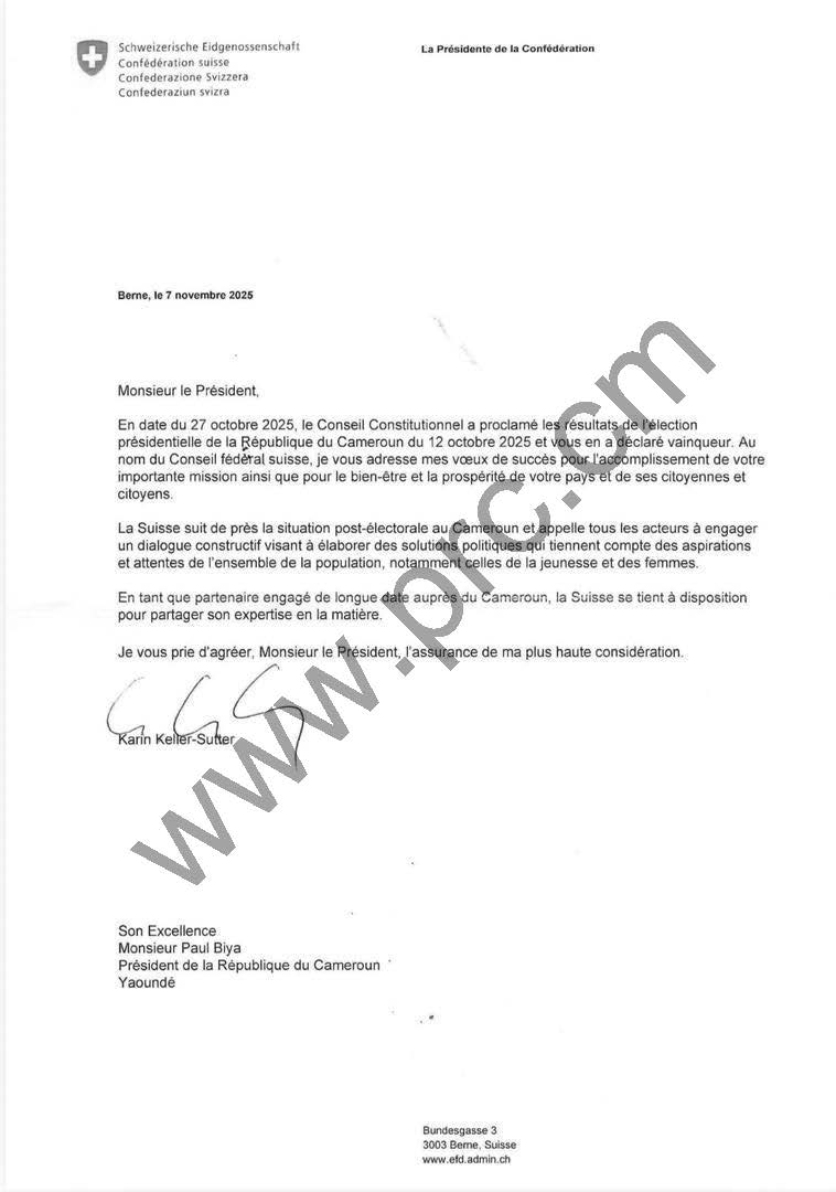 Félicitations de SE Karin Keller-Sutter, Présidente de la Confédération suisse à SE Paul Biya, suite à sa réélection à la Magistrature Suprême du Cameroun, le 27 octobre 2025 Imprimer Tweet Suivant >