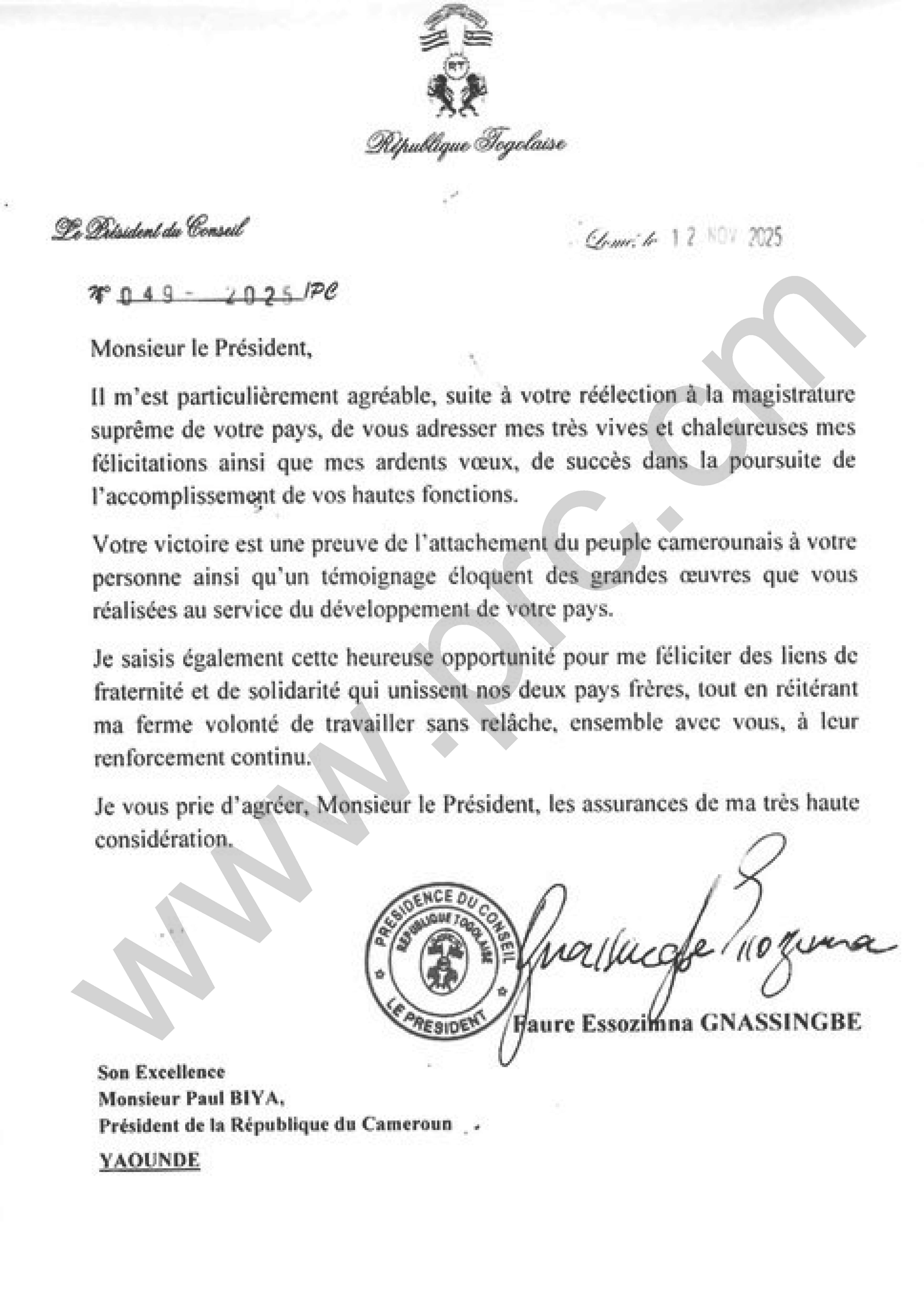 Message de félicitations du Président du Conseil du Togo, Son Excellence Faure Essozimna GNASSINGBÉ, au Président Paul Biya, suite à sa réélection à la Magistrature suprême de la République du Cameroun Imprimer Tweet < Précédent Suivant >