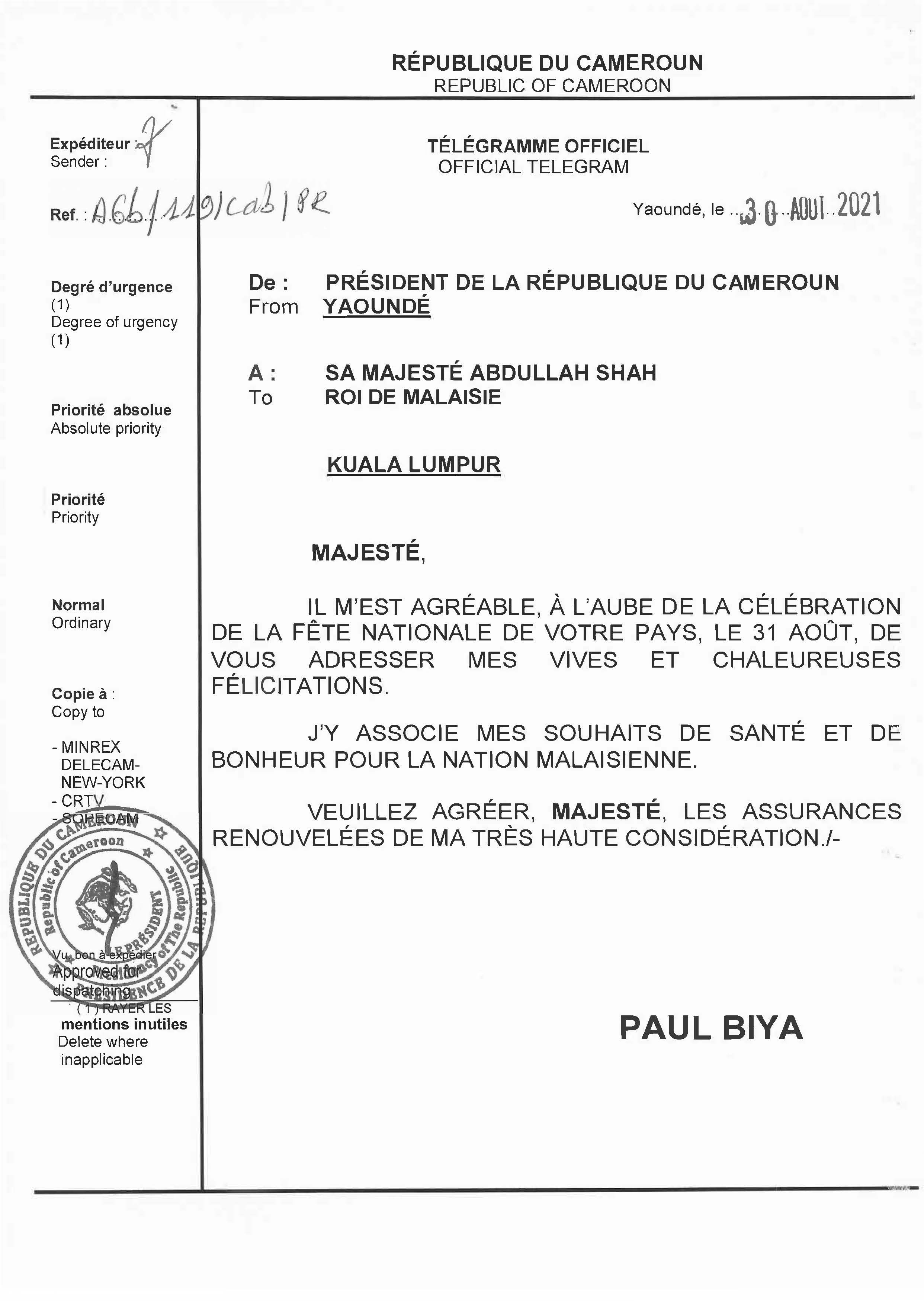 Message de félicitations du Chef de l’État à Sa Majesté Abdullah Shah, à l'occasion de la fête nationale de la Malaisie, le 31 août 2021 Imprimer Tweet < Précédent Suivant >