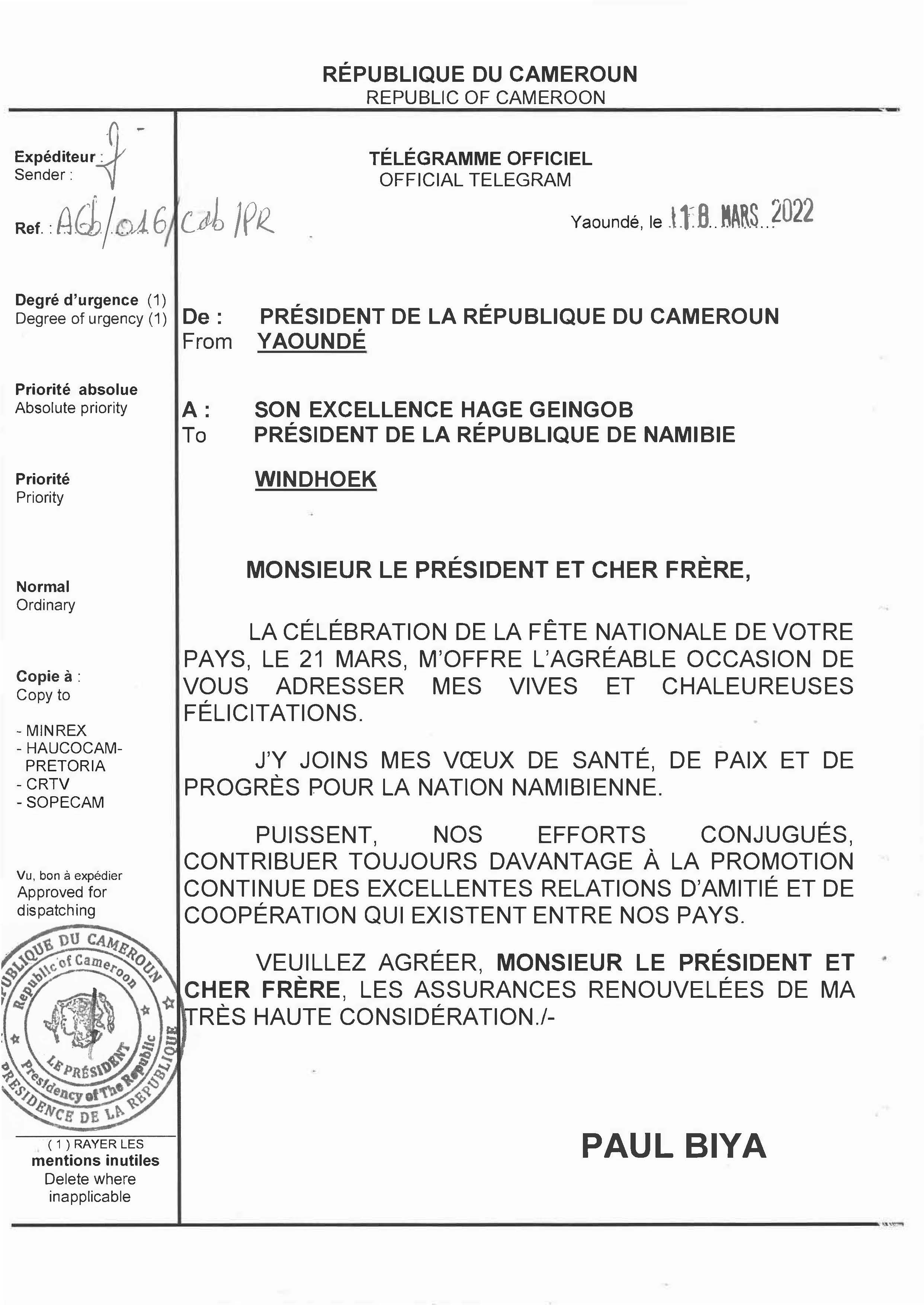 Message de félicitations du Chef de l’État à S.E. Hage Geingob, à l'occasion de la fête nationale de la République de Namibie, le 21 mars 2022 Imprimer Tweet < Précédent Suivant >