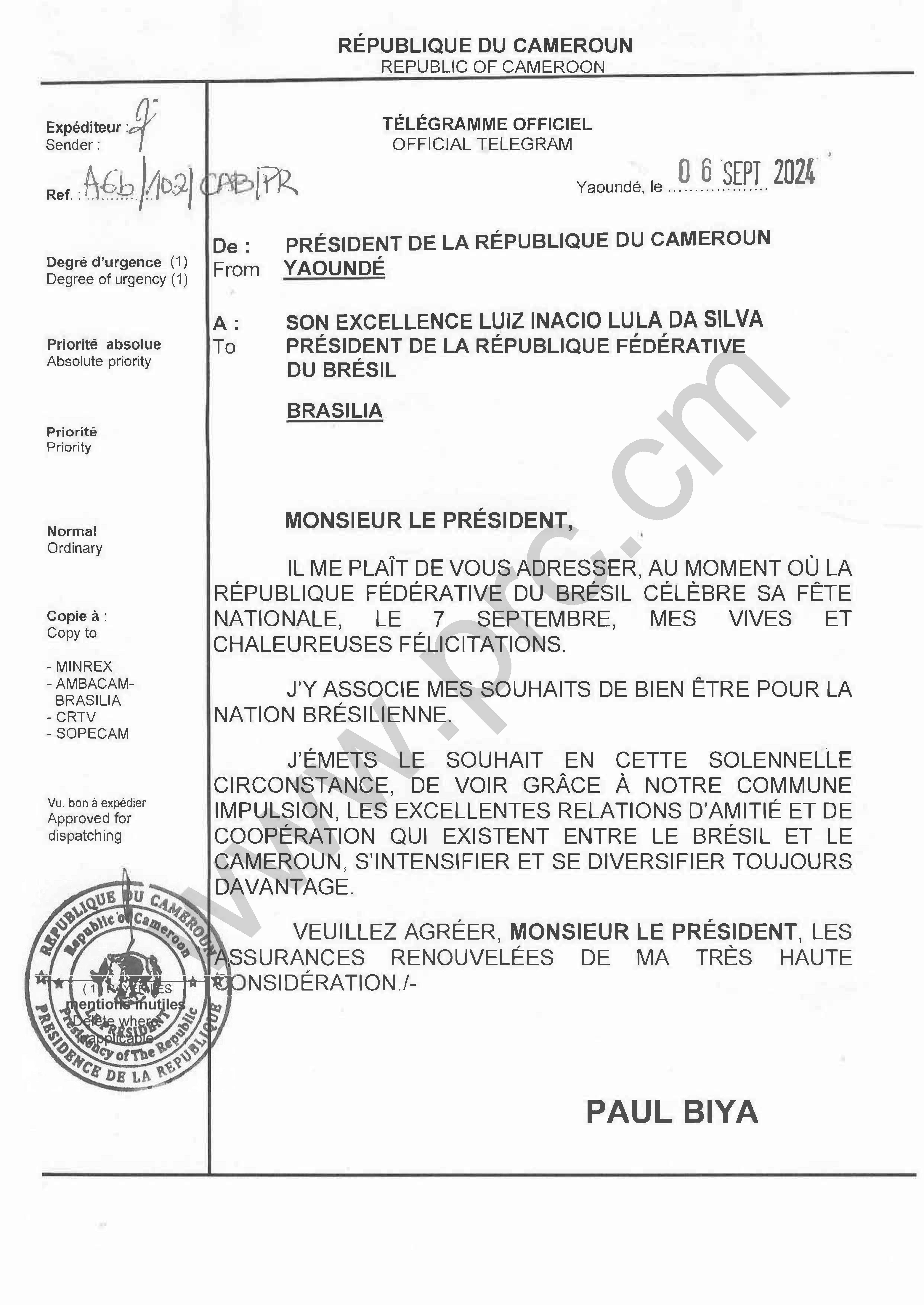 Message de félicitations du Président Paul Biya à Son Excellence Luiz Inacio Lula Da Silva, à l’occasion de la célébration de la fête nationale de la République Fédérative du Brésil, le 7 septembre 2024 Imprimer Tweet < Précédent Suivant >