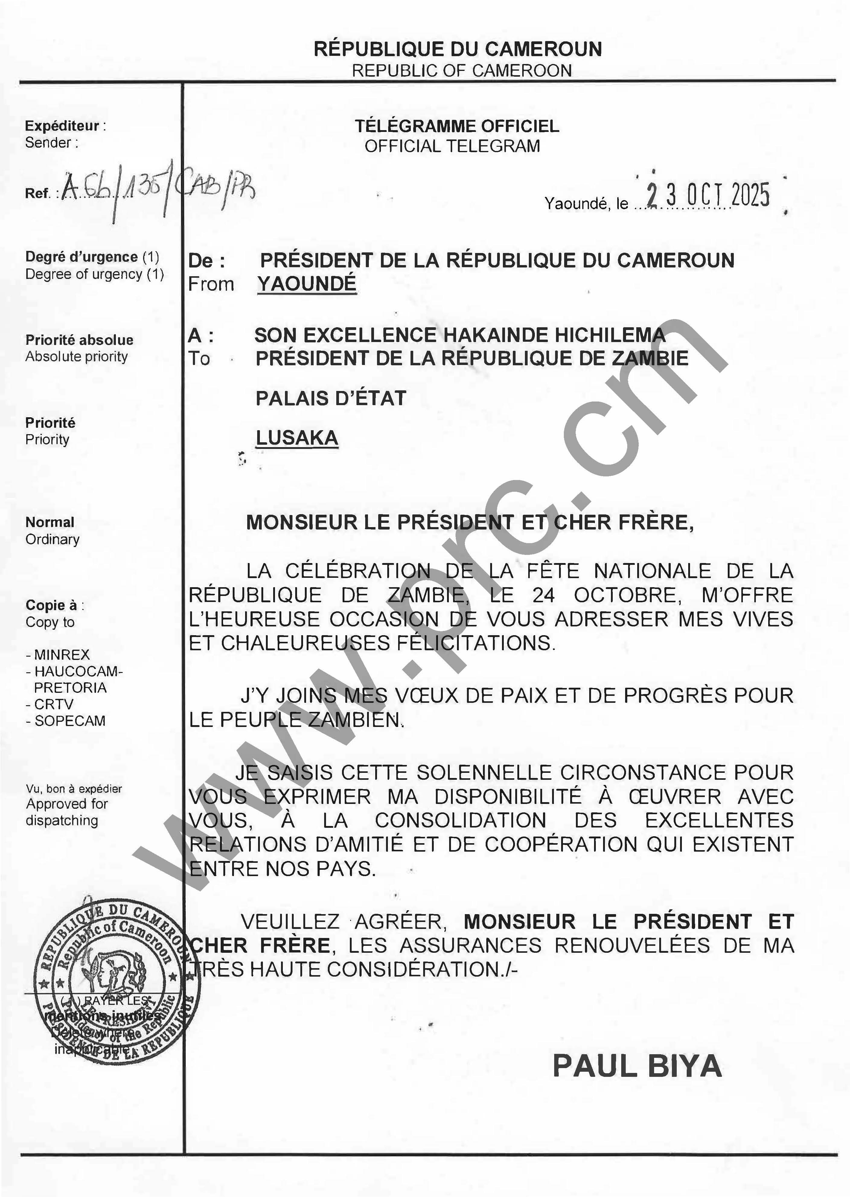 Message de félicitations du Chef de l’Etat à SE Hakainde Hichilema, à l'occasion de la fête nationale de la République de Zambie, le 24 octobre 2025 Imprimer Tweet Suivant >