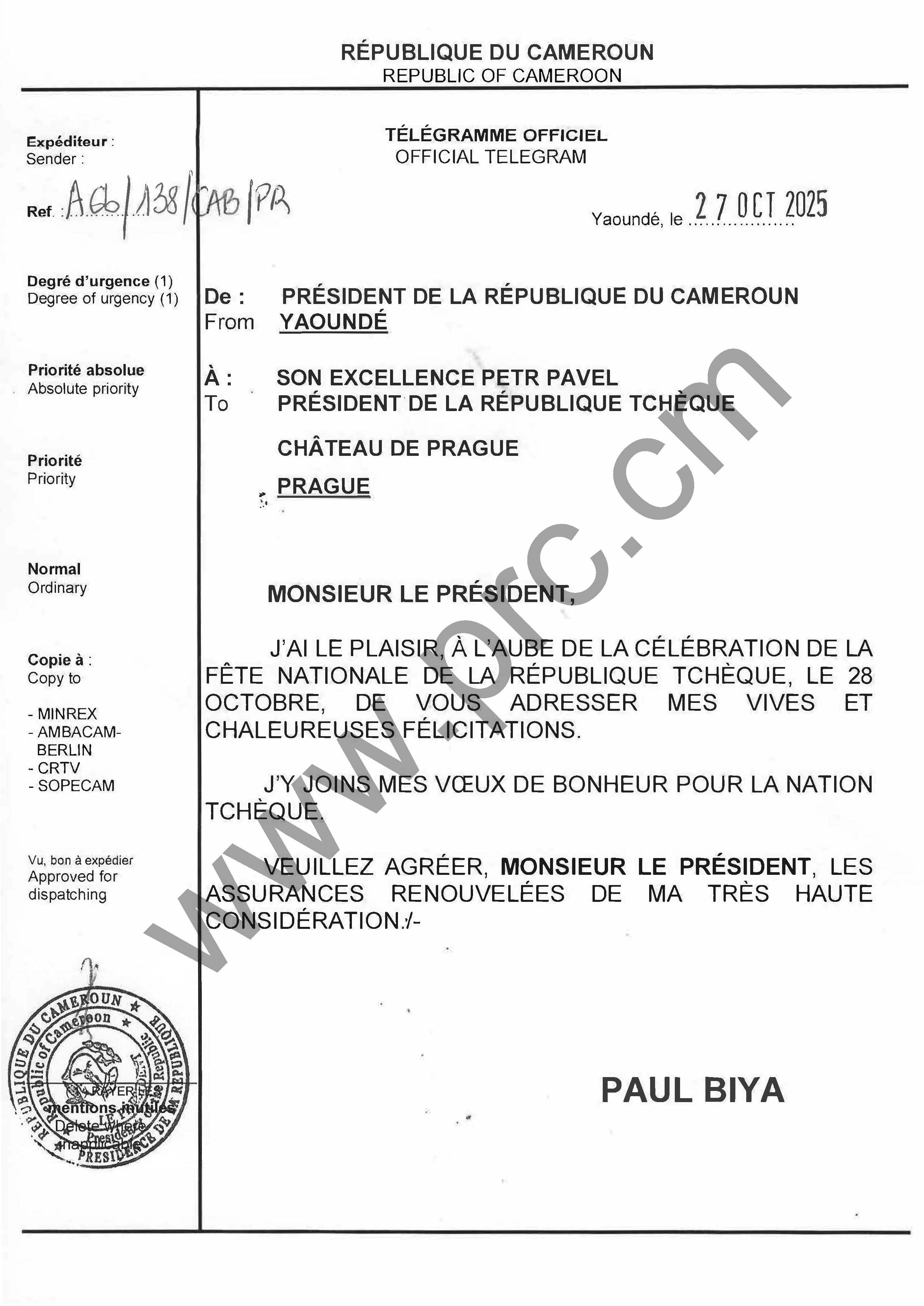 Message de félicitations du Chef de l’Etat à SE Petr Pavel, à l'occasion de la fête nationale de la République Tchèque, le 28 octobre 2025 Imprimer Tweet < Précédent Suivant >