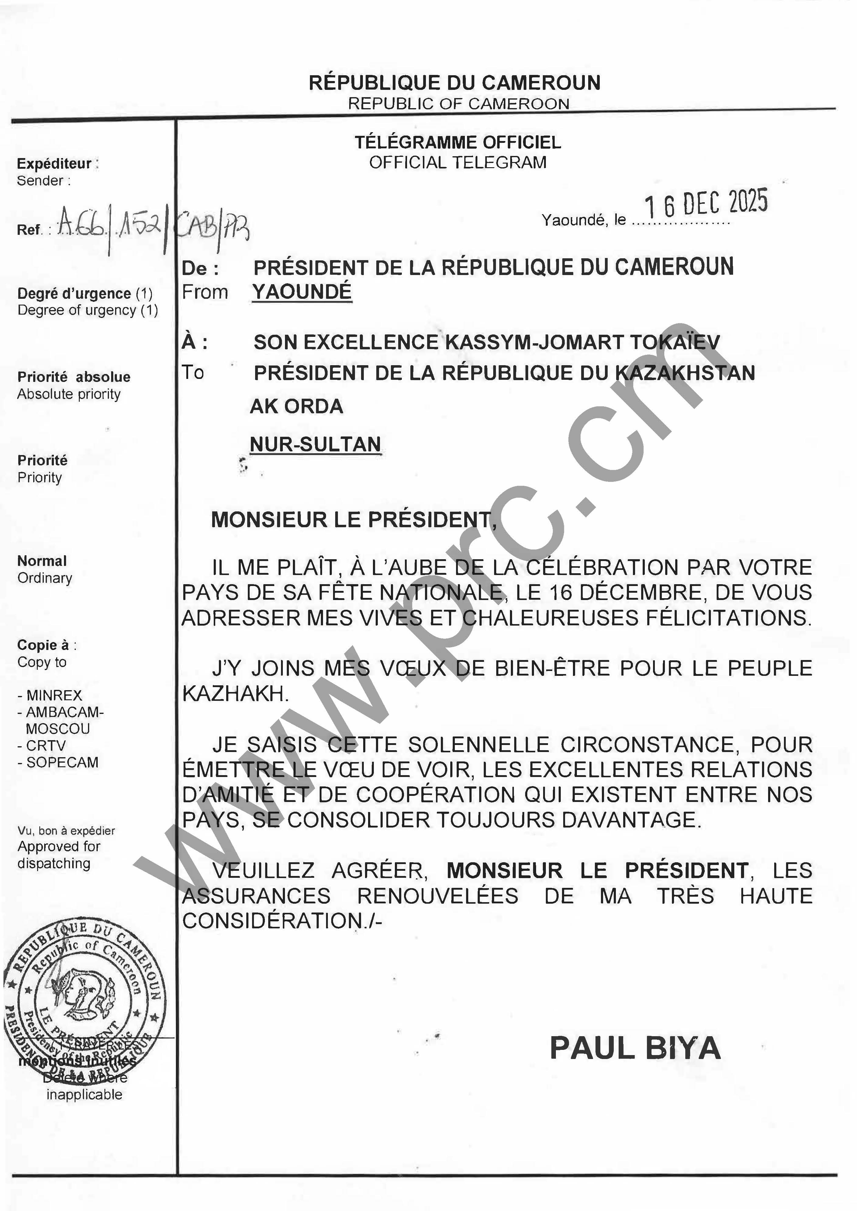 Message de félicitations du Chef de l’Etat à SE Kassym-Jomart Tokaïev, à l'occasion de la fête nationale la République de Kazakhstan , le 16 décembre 2025 Imprimer Tweet Suivant >