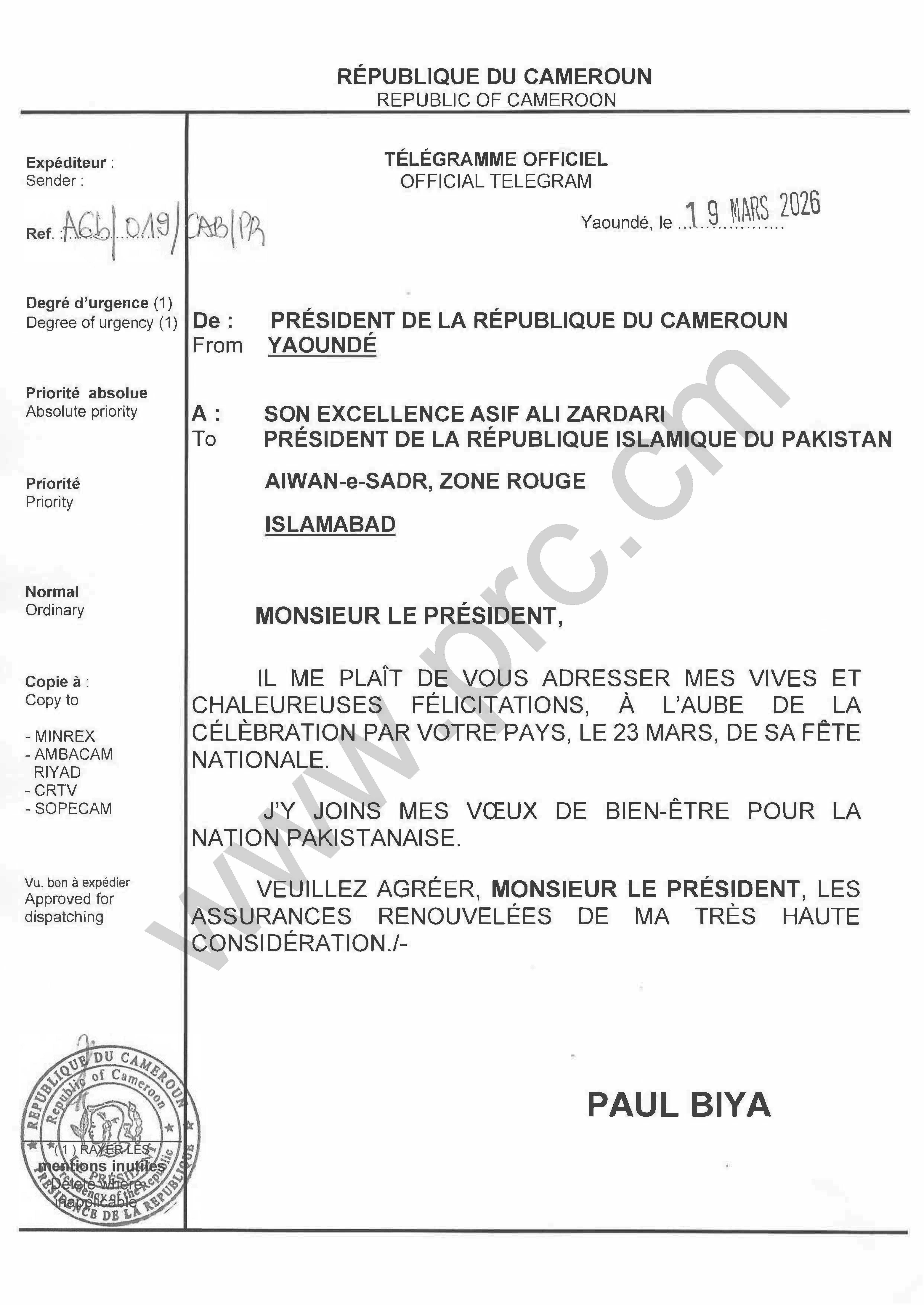 Message de félicitations du Président Paul Biya à Son Excellence Asif Ali Zardari, à l’occasion de la célébration de la fête nationale de la République Islamique du Pakistan, le 23 mars 2026 Imprimer Tweet Suivant >